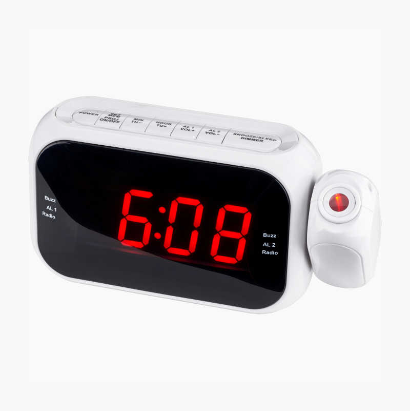 Med justerbar projektor som viser klokken i taket eller på veggen. FM-radio med minne for radiostasjoner. Foretrekker du å våkne til siste nytt? Det kan ordnes med en klokkeradio.